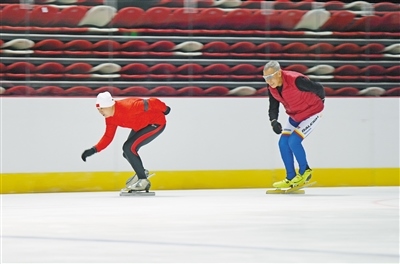 市民在呼和浩特體育中心綜合體育館冰場(chǎng)內(nèi)滑冰。 記者 孟和朝魯 攝