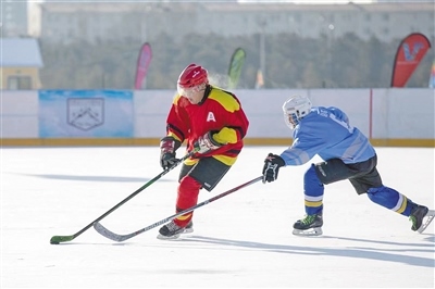 在呼和浩特市一冰場(chǎng)內(nèi),球員在冰球比賽中拼搶。記者 于濤 攝