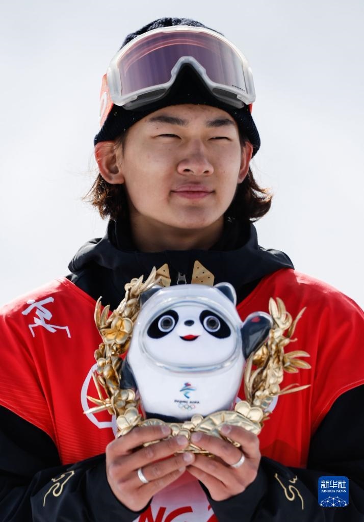 2月7日,中國(guó)選手蘇翊鳴在頒發(fā)紀(jì)念品儀式上。
