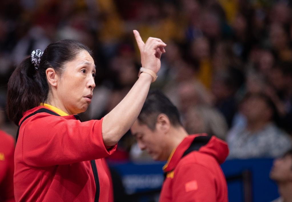 10月1日,中國隊(duì)主教練鄭薇(前)在比賽中指揮。新華社發(fā)(胡涇辰攝)