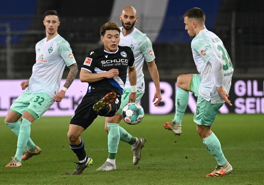 2021年3月10日,當(dāng)時(shí)效力于比勒菲爾德隊(duì)的日本球員堂安律(前左)在德甲比賽中帶球突破。他現(xiàn)在效力于德甲弗賴(lài)堡俱樂(lè)部。新華社發(fā)(烏爾里希·胡夫納格爾 攝)