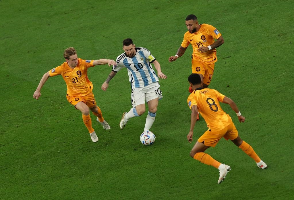 12月9日,阿根廷隊球員梅西(左二)在對荷蘭隊的比賽中進(jìn)攻。新華社記者 潘昱龍 攝