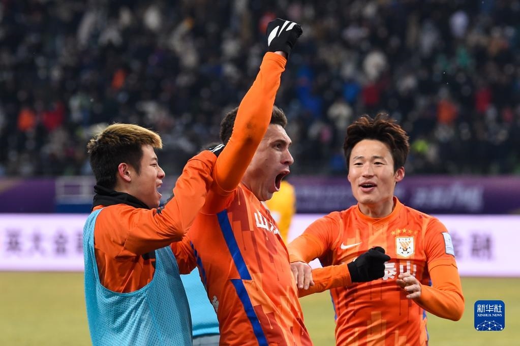 1月15日,山東泰山隊球員莫伊塞斯(中)在比賽中慶祝得分。