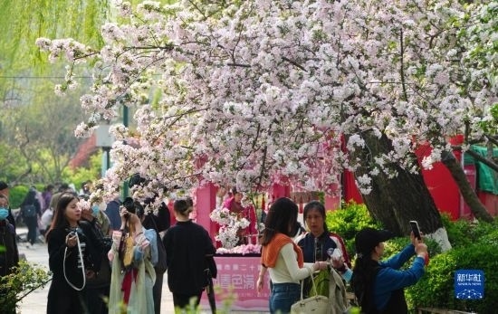 3月21日,在濟南市五龍?zhí)豆珗@,人們觀賞盛開的海棠花。