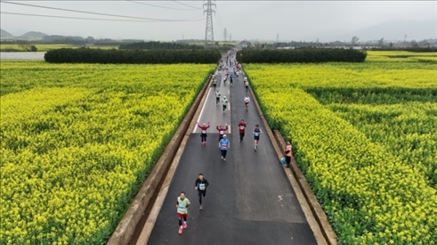 來(lái)自海內(nèi)外的1萬(wàn)余名專業(yè)運(yùn)動(dòng)員和馬拉松愛好者在云南羅平縣的花海中奔跑。何新文攝