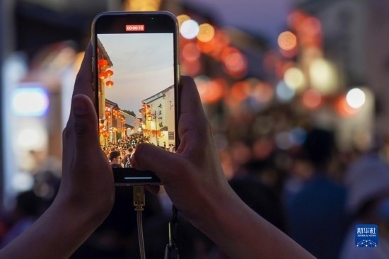 一名游客在江蘇蘇州山塘街拍照留念(4月10日攝)。