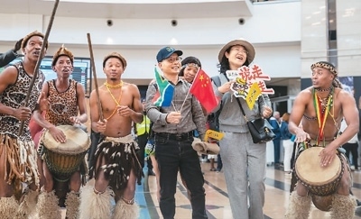 中國(guó)旅游團(tuán)抵達(dá)南非,南非旅游局在機(jī)場(chǎng)舉行歡迎儀式。 新華社記者 張譽(yù)東攝