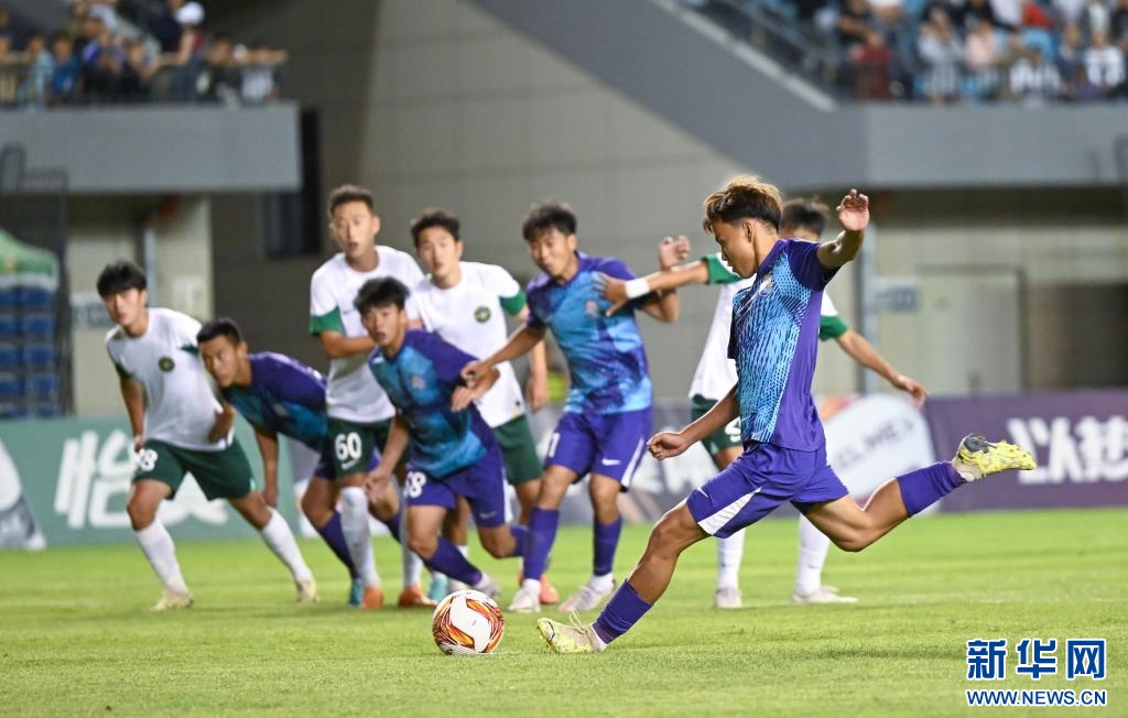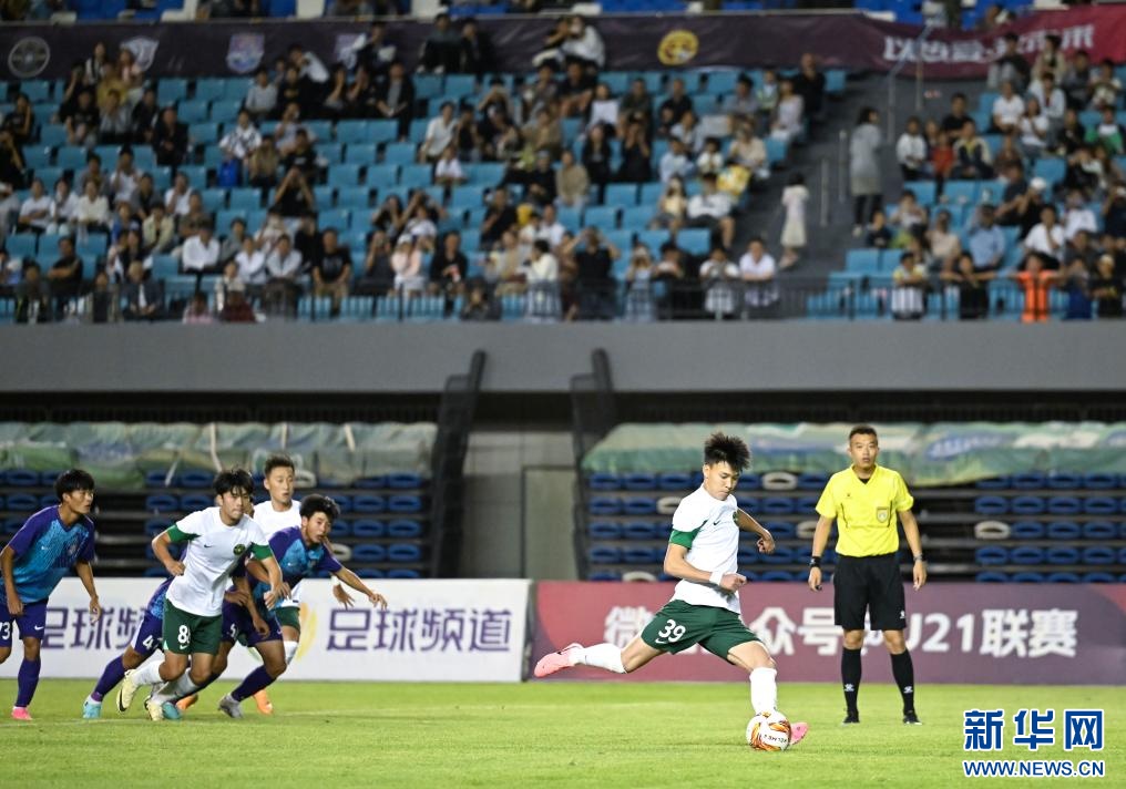 ??6月15日,浙江俱樂部U21隊球員王鈺棟(前右)在比賽中主罰點球得分。