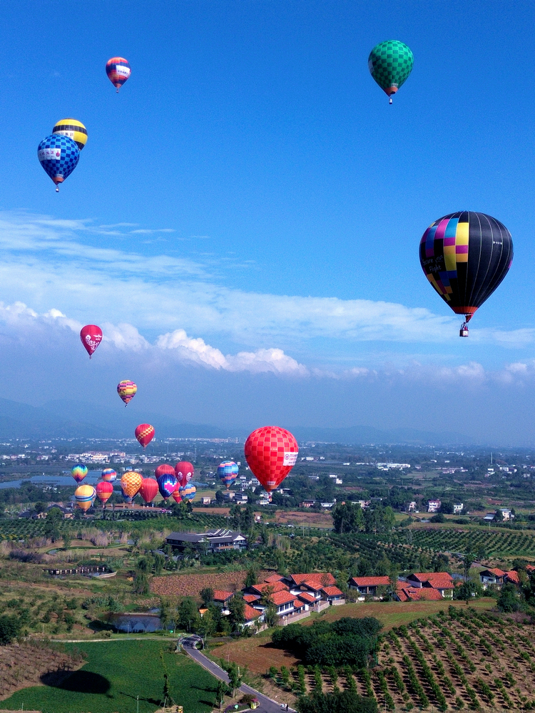 隨著開(kāi)幕儀式的推進(jìn),30支熱氣球依次完成點(diǎn)火、充氣,在歡呼聲中緩緩升空。紅黃藍(lán)綠的熱氣球與郁郁蔥蔥的柑橘園、錯(cuò)落有致的川西民居相映成趣,構(gòu)成一幅絕美畫(huà)卷。據(jù)了解,此次全國(guó)熱氣球精英賽(四川金堂站)作為活動(dòng)核心賽事,將在10月15日-19日期間開(kāi)展游蕩華爾茲、定點(diǎn)投靶、肘形飛行等10余項(xiàng)專業(yè)競(jìng)技項(xiàng)目,最讓人期待的是本次賽事將熱氣球飛躍龍泉山作為了長(zhǎng)距離飛行的競(jìng)賽科目,這將是熱氣球首次飛越龍泉山。屆時(shí),參賽選手在比賽的同時(shí)還可以在空中觀賞龍泉山脈、千里沱江、絕美古剎等景觀。