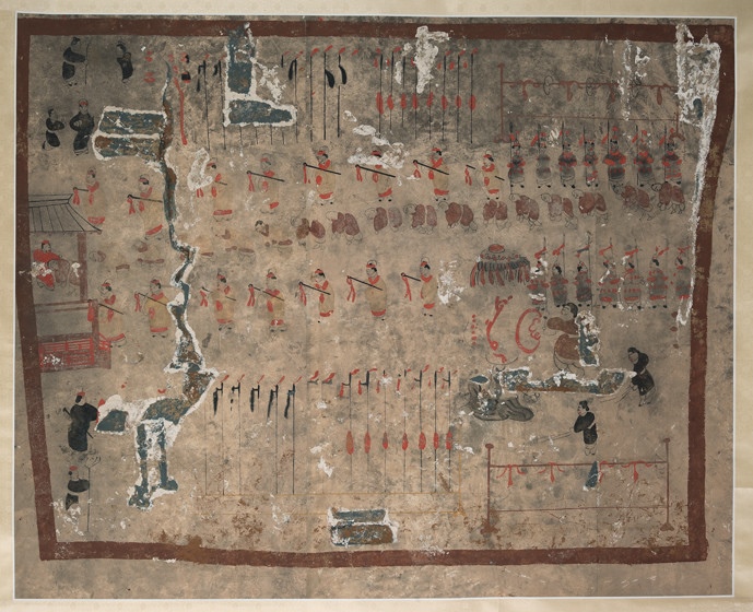 再繞回前室中層,橫跨東北西3面墓壁即是《護烏桓校尉出行圖》。墓主人所乘軺車,駕3匹黑馬,榜題“使持節(jié)護烏桓校尉”等字,主車前后有鼓車、斧車,層層環(huán)護眾多武官、兵丁,隨從有“別駕從事”“功曹從事”“校尉行部”等下屬官職,連車列騎,旗旌飄揚,場面極為壯觀。中室東壁下半部描繪的是《寧城圖》與《護烏桓校尉幕府圖》。《寧城圖》畫有城垣、城門、衙署等內(nèi)容,其中寧城南門外武士持戟列隊、身著胡服的少數(shù)民族人物徐徐入內(nèi)的場景最為突出。占據(jù)主畫面的是《護烏桓校尉幕府圖》,由于任護烏桓校尉官職是墓主人一生中最值得炫耀的經(jīng)歷,所以,此圖描繪得最為詳細夸張,是整個壁畫中的核心部分。整個幕府分為堂院、營舍和庖舍3個部分,堂屋為高大的廡殿式房屋,墓主人端坐堂上,堂下藝人在表演樂舞雜耍,少數(shù)民族人物伏拜覲見,周圍環(huán)立官吏武士,場面喧囂隆重。營舍位于幕府后院,是幕府中管理軍務的機構所在,庖舍位于幕府的西南角,掌管幕府廚飲之事。