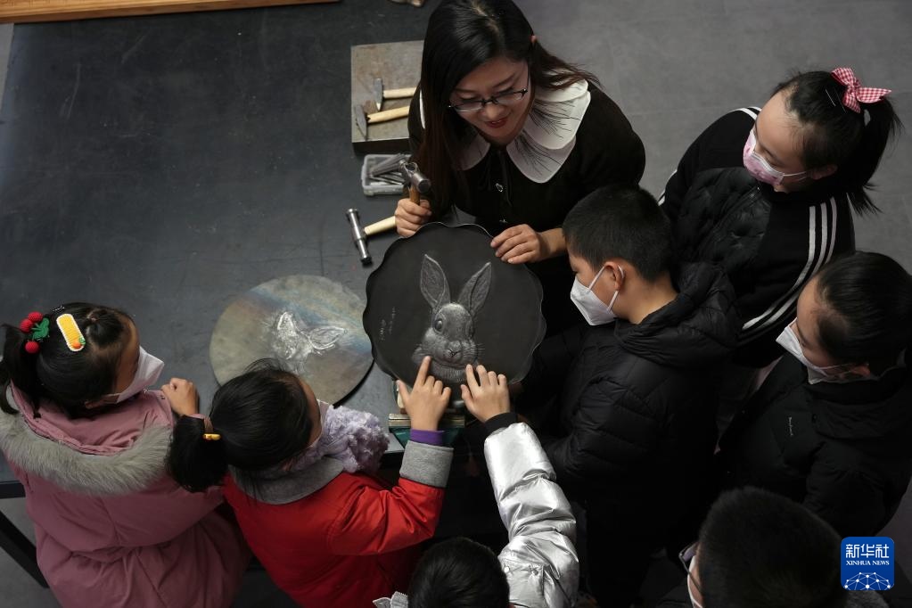 1月12日,在石家莊市新華區(qū)一個文化工作室,一名鐵板浮雕藝人向小朋友展示生肖兔作品。新華社記者 駱學峰 攝