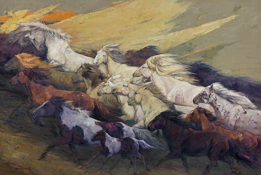 哈日巴拉油畫《逐夢(mèng)前行蒙古馬》