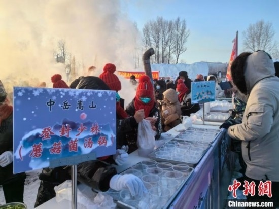 活動(dòng)現(xiàn)場(chǎng)展示的寒地美食是一大亮點(diǎn)。熱氣騰騰的“登封少林”“泰安福祿”“華山論劍”等極具武俠味道的“江湖美食”讓參會(huì)者大飽口福,忘卻了-26℃的寒冷。