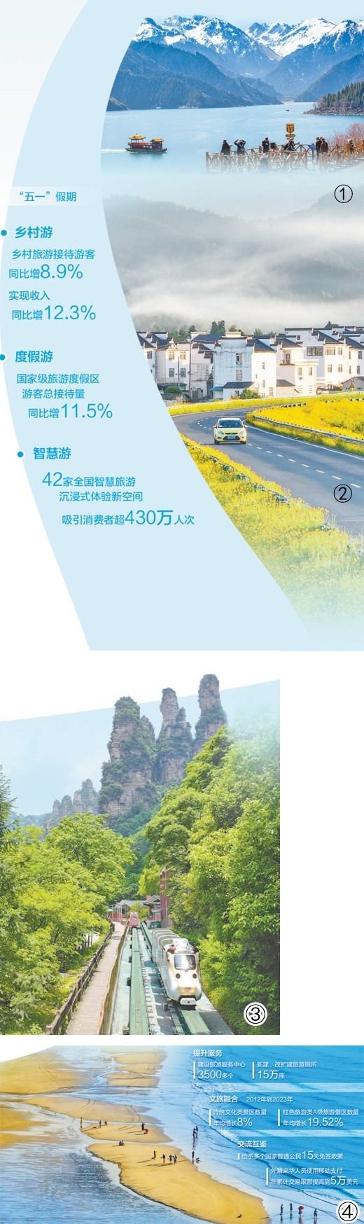 圖①:新疆天池景區(qū)。張 昀攝(影像中國) 圖②:安徽黃山休寧縣鄉(xiāng)村風(fēng)光。施亞磊攝(影像中國)圖③:湖南張家界國家森林公園。吳勇兵攝(影像中國) 圖④:海南萬寧石梅灣。劉國興攝(影像中國)數(shù)據(jù)來源:文化和旅游部等
