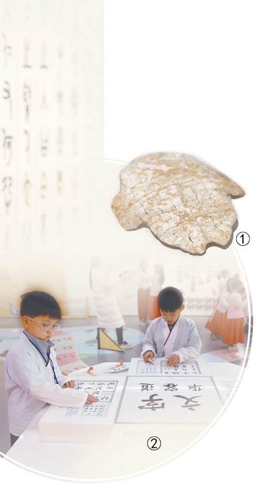 圖①:中國(guó)文字博物館館藏的卜甲。 丁俊豪攝(影像中國(guó)) 圖②:學(xué)生在博物館體驗(yàn)“文字華容道”游戲。楊少甜攝