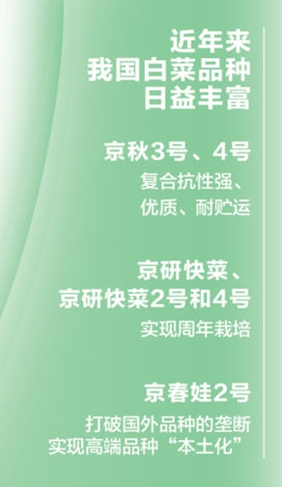近年來,我國白菜育種實(shí)力突飛猛進(jìn),品種日益豐富,實(shí)現(xiàn)了從單一“秋播冬貯”向優(yōu)勢(shì)產(chǎn)區(qū)生產(chǎn)、產(chǎn)品多樣化和周年生產(chǎn)轉(zhuǎn)變。培育出了復(fù)合抗性強(qiáng)、優(yōu)質(zhì)、耐貯運(yùn)的品種“京秋3號(hào)、4號(hào)”等,高品質(zhì)、速生苗用品種“京研快菜、京研快菜2號(hào)和4號(hào)”3個(gè)品種搭配實(shí)現(xiàn)了周年栽培,解決了生產(chǎn)上長期缺乏冬春和夏季栽培專用品種的難題。還育成了娃娃菜、快菜、紹菜、金絲白等高品質(zhì)品種,尤其是“京春娃2號(hào)”一舉打破國外品種的壟斷,它比國外品種早熟5至7天,種植密度高25%,畝收入增長30%,已成為國產(chǎn)娃娃菜第一大品種,實(shí)現(xiàn)了高端品種的“本土化”。