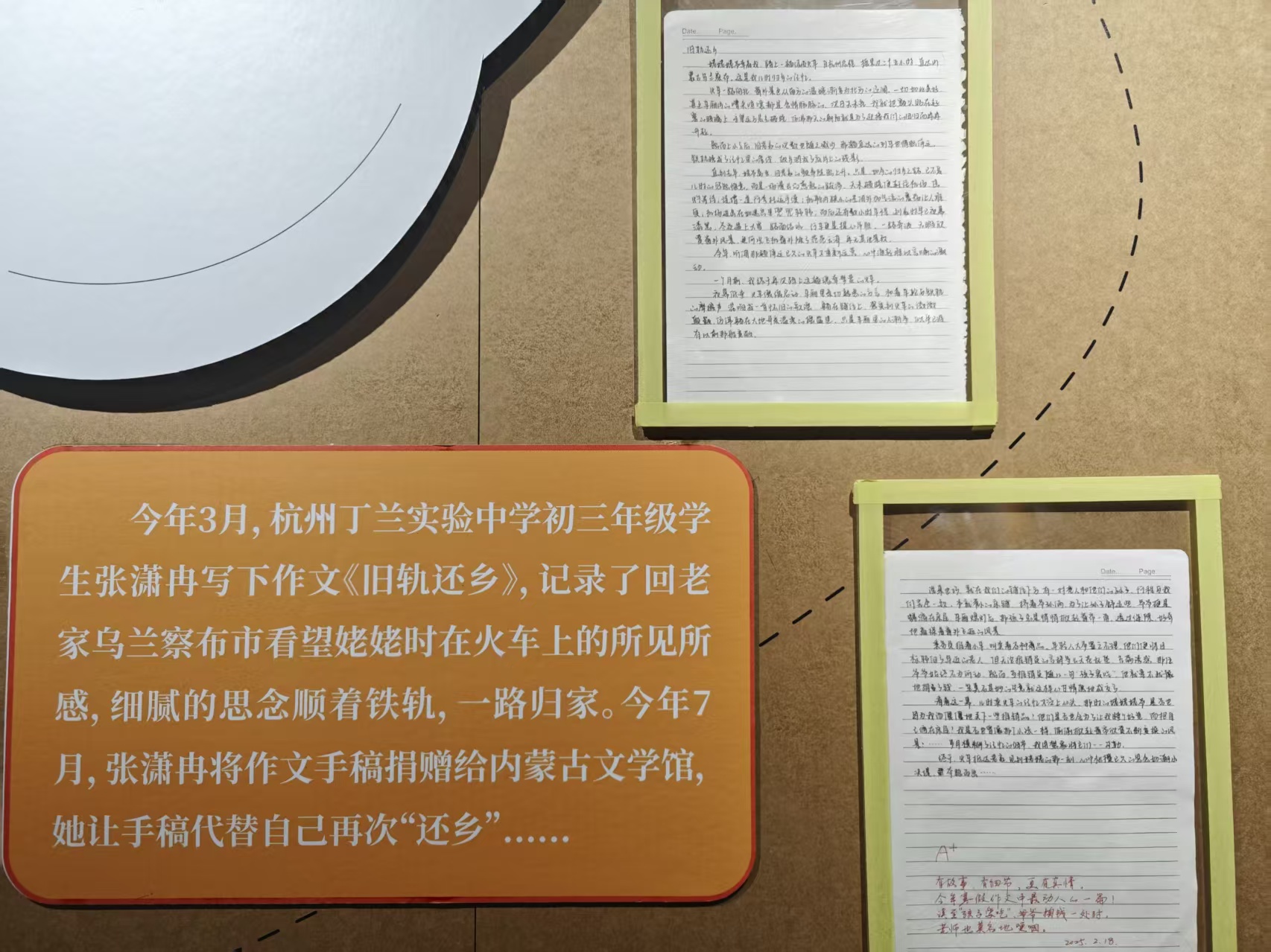 值得一提的是,憑借作文《舊軌還鄉(xiāng)》引起網(wǎng)友廣泛關(guān)注和共鳴的內(nèi)蒙古籍女孩張瀟冉,今年7月將手稿捐贈給了內(nèi)蒙古文學館,本次展覽對《舊軌還鄉(xiāng)》手稿進行展出。展覽還展出了生于2007年的少女詩人姜二嫚的詩作,年少成名的姜二嫚用7歲時所作的《光》向全國小詩人們送上問候。