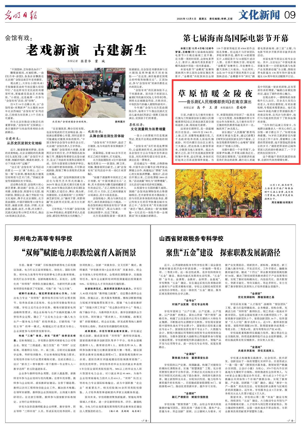 2025年12月5日《光明日?qǐng)?bào)》第9版刊發(fā)了《原情暖金陵夜——音樂(lè)劇《人民楷模都貴瑪》在南京演出》的文章,報(bào)道了日前,內(nèi)蒙古烏蘭察布市察右后旗烏蘭牧騎原創(chuàng)音樂(lè)劇《人民楷模都貴瑪》在江蘇南京演藝星空劇場(chǎng)連續(xù)上演,現(xiàn)場(chǎng)座無(wú)虛席。這個(gè)跨越千里的民族團(tuán)結(jié)故事,在新時(shí)代依然熠熠生輝。