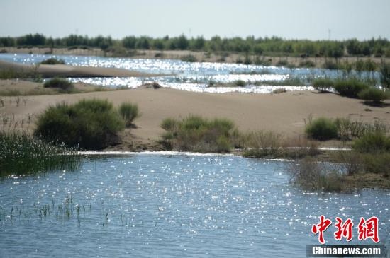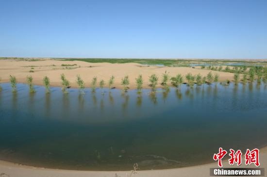 7月24日,引自黃河的凌水讓沙漠上充滿生機(jī)。據(jù)悉,中國(guó)第七大沙漠--庫(kù)布齊沙漠所處的杭錦旗境內(nèi),每年過(guò)境水量310億立方米,當(dāng)?shù)匾荒耆忠坏臅r(shí)間都是凌汛期。政府因地制宜,2016年投資建成分凌引水渠、生態(tài)圍堤等設(shè)施,自2016年至2018年黃河凌汛期以來(lái),累計(jì)分凌5千余萬(wàn)立方米,形成約36平方公里保護(hù)濕地的面積,原來(lái)為沙漠的地貌逐漸變成綠洲,農(nóng)牧民開始發(fā)展野牛養(yǎng)殖與農(nóng)家樂(lè)旅游業(yè)。中新社記者劉文華攝