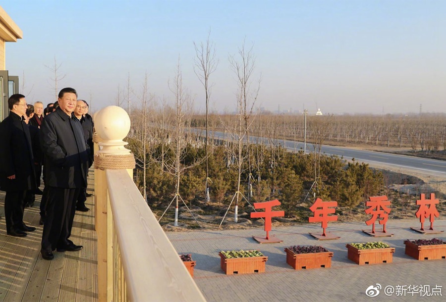 雄安新區(qū)堅(jiān)持生態(tài)優(yōu)先、綠色發(fā)展,率先啟動(dòng)生態(tài)基礎(chǔ)設(shè)施建設(shè)和環(huán)境整治,目前已完成11萬(wàn)畝“千年秀林”建設(shè)。16日下午,習(xí)近平總書(shū)記來(lái)到“千年秀林”大清河片林一區(qū)造林區(qū)域,乘車(chē)穿行林區(qū)察看林木長(zhǎng)勢(shì),登上秀林驛站二層平臺(tái)遠(yuǎn)眺林區(qū)全貌,同當(dāng)?shù)刈o(hù)林員代表親切交流。他說(shuō),藍(lán)天、碧水、綠樹(shù),藍(lán)綠交織,將來(lái)生活的最高標(biāo)準(zhǔn)就是生態(tài)好。雄安新區(qū)過(guò)去有一定的基礎(chǔ),現(xiàn)在搞“千年秀林”,將來(lái)這里一定是最宜居的地方。綠水青山就是金山銀山,雄安新區(qū)就要靠這樣的生態(tài)環(huán)境來(lái)體現(xiàn)價(jià)值、增加吸引力。(記者張曉松、謝環(huán)馳、鞠鵬)