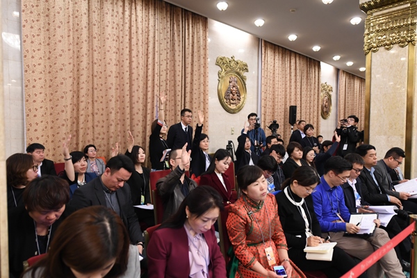 3月6日下午,十三屆全國人大二次會議內(nèi)蒙古代表團(tuán)舉行全團(tuán)會議,審議政府工作報(bào)告并向境內(nèi)外媒體開放。來自17個國家和地區(qū)的78家媒體、90名記者到場采訪。內(nèi)蒙古日報(bào)社融媒體記者 袁永紅 攝