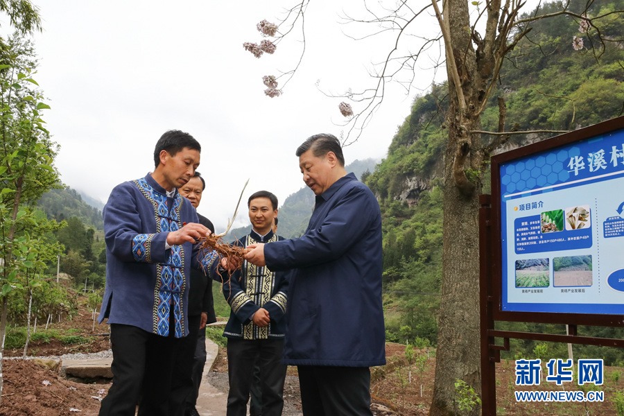 這是4月15日下午,習(xí)近平在石柱土家族自治縣中益鄉(xiāng)華溪村了解該村通過(guò)種植中藥材黃精等特色經(jīng)濟(jì)作物帶動(dòng)村民脫貧的情況。 新華社記者 鞠鵬 攝