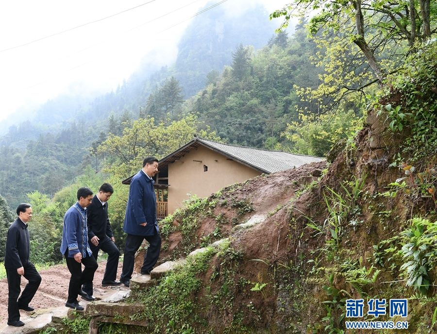 這是4月15日下午,在石柱土家族自治縣中益鄉(xiāng)華溪村,習(xí)近平踏著濕滑的石階登上陡坡,前往貧困戶(hù)譚登周家看望。 新華社記者 謝環(huán)馳 攝