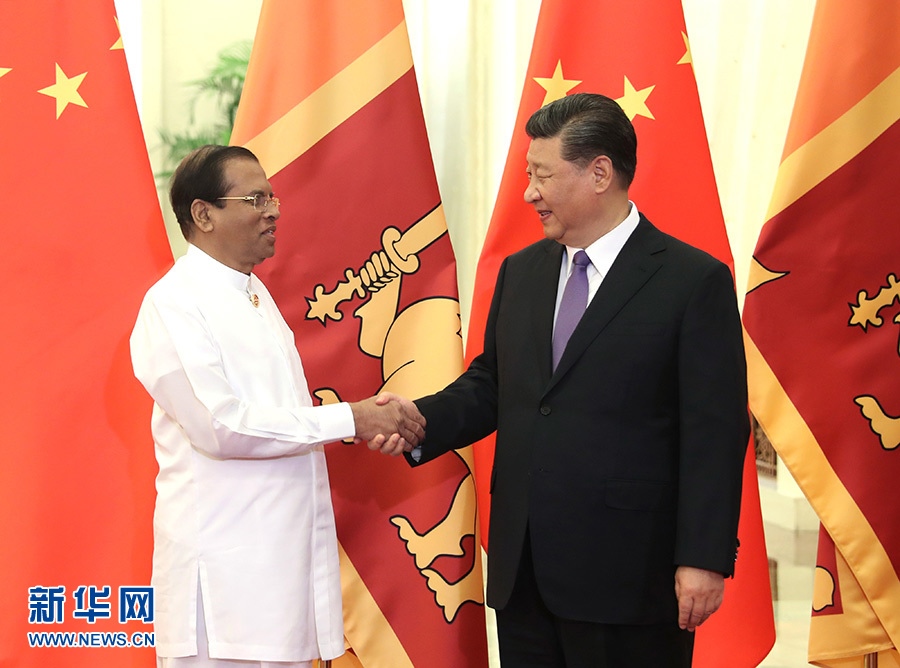 5月14日,國家主席習(xí)近平在北京人民大會堂會見來華出席亞洲文明對話大會的斯里蘭卡總統(tǒng)西里塞納。 新華社記者 李濤 攝