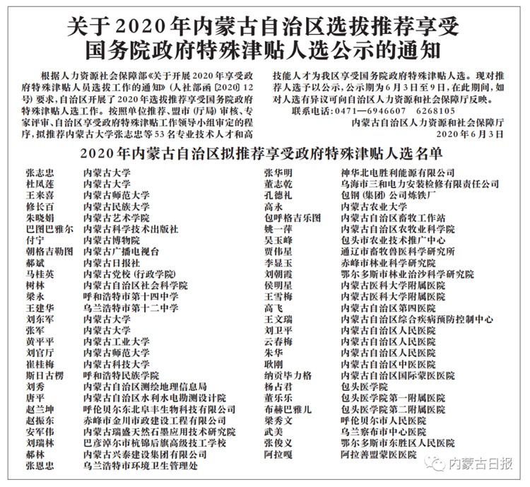 根據(jù)人力資源社會(huì)保障部《關(guān)于開(kāi)展2020年享受政府特殊津貼人員選拔工作的通知》(人社部函〔2020〕12號(hào))要求,自治區(qū)開(kāi)展了2020年選拔推薦享受?chē)?guó)務(wù)院政府特殊津貼人選工作。按照單位推薦、盟市(廳局)審核、專家評(píng)審、自治區(qū)享受政府特殊津貼工作領(lǐng)導(dǎo)小組審定的程序,擬推薦內(nèi)蒙古大學(xué)張志忠等53名專業(yè)技術(shù)人才和高技能人才為我區(qū)享受?chē)?guó)務(wù)院政府特殊津貼人選。現(xiàn)對(duì)推薦人選予以公示,公示期為6月3日至9日,在此期間,如對(duì)人選有異議可向自治區(qū)人力資源和社會(huì)保障廳反映。