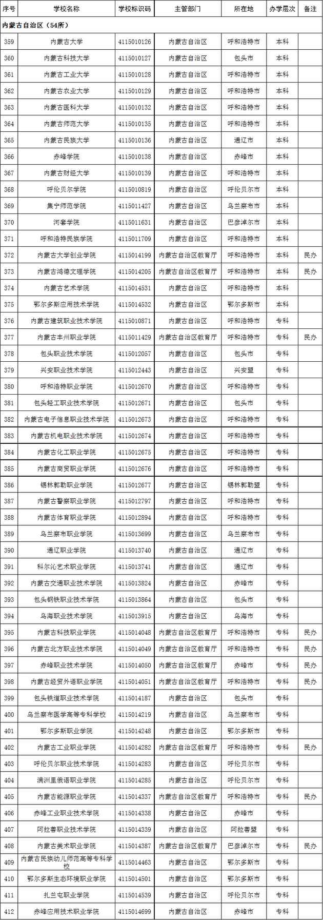 截至2020年6月30日,全國高等學(xué)校共計3005所,其中:普通高等學(xué)校2740所,含本科院校1258所、高職(??疲┰盒?482所;成人高等學(xué)校265所。本名單未包含港澳臺地區(qū)高等學(xué)校。以下為內(nèi)蒙古自治區(qū)2020年普通高等學(xué)校名單(54所)。