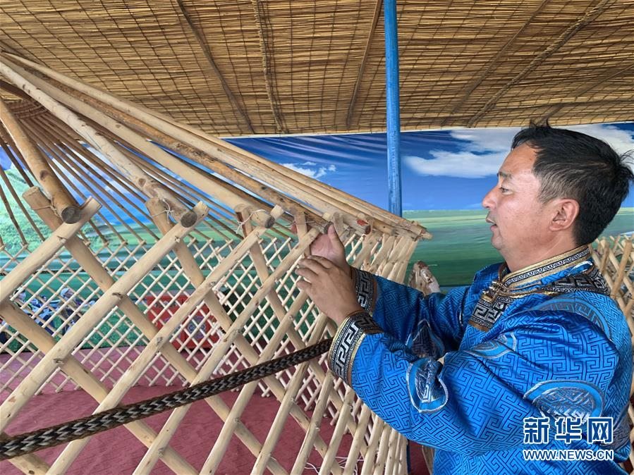 7月17日,布仁巴雅爾在展示編織完成的蒙古包圍壁。新華社記者 王靖 攝