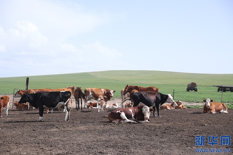 8月2日,其日麥拉圖家的幾頭牛在草場上吃草。新華網(wǎng)記者焦鵬攝