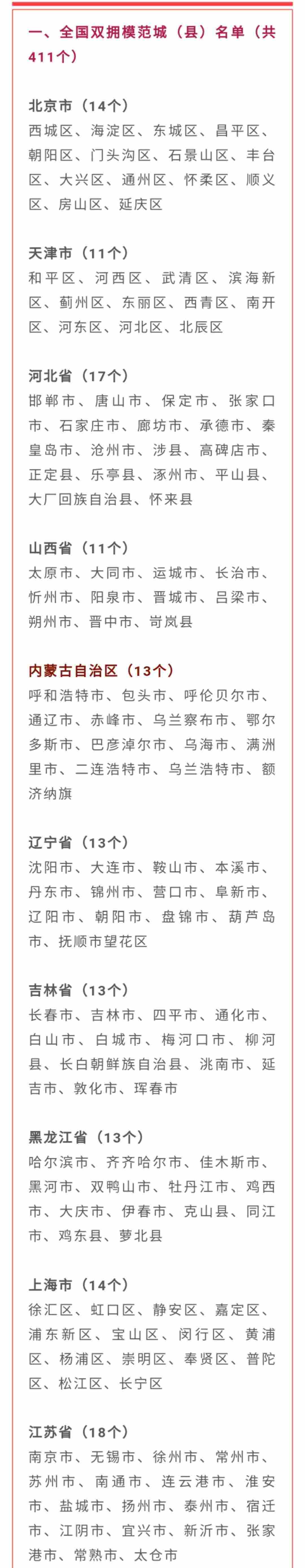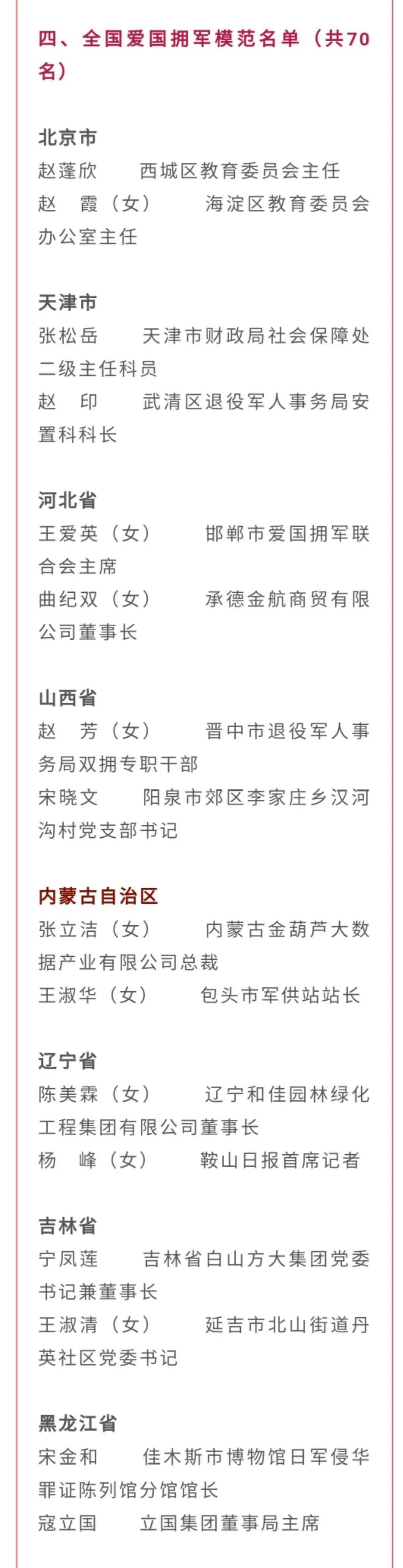 10月20日,全國(guó)雙擁模范城(縣)命名暨雙擁模范單位和個(gè)人表彰大會(huì)在北京舉行,大會(huì)宣讀了關(guān)于命名411個(gè)全國(guó)雙擁模范城(縣),關(guān)于表彰全國(guó)愛國(guó)擁軍模范單位和擁政愛民模范單位,關(guān)于表彰全國(guó)愛國(guó)擁軍模范和擁政愛民模范的決定。內(nèi)蒙古自治區(qū)13個(gè)市縣(旗)榮膺全國(guó)雙擁模范城(縣),1個(gè)鎮(zhèn)、2名全國(guó)愛國(guó)擁軍模范受到表彰。全部名單如下:
