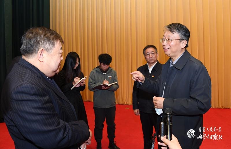 11月8日上午,在學習貫徹黨的十九屆五中全會精神中央宣講團內(nèi)蒙古報告會結(jié)束后,聆聽報告會的部分人員與宣講人沈春耀互動交流。內(nèi)蒙古日報記者 袁永紅 攝