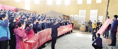 在大青山抗日根據(jù)地展館重溫入黨誓詞。
