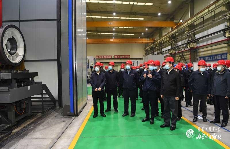 4月21日,自治區(qū)黨委書記、人大常委會主任石泰峰,與參加自治區(qū)推動高質(zhì)量發(fā)展重大項目建設(shè)動員大會的代表一起觀摩南高齒(包頭)傳動設(shè)備有限公司風(fēng)電齒輪箱二期擴建項目。內(nèi)蒙古日報社融媒體記者 袁永紅 攝
