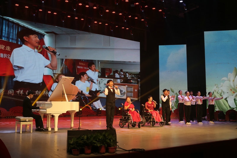 跟黨走·內(nèi)蒙古自治區(qū)殘疾人聯(lián)合會(huì)慶祝建黨100周年全區(qū)殘疾人文藝演出”,在呼和浩特市舉辦。來自全區(qū)各級(jí)殘聯(lián)組織的近200名殘疾人演員和中國殘疾人藝術(shù)團(tuán)的演員們?yōu)楝F(xiàn)場(chǎng)及網(wǎng)絡(luò)直播的觀眾們帶來了一場(chǎng)規(guī)模宏大、精彩紛呈視聽盛宴。