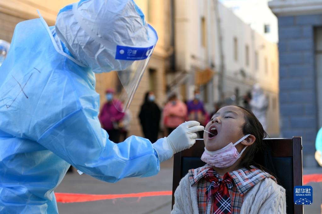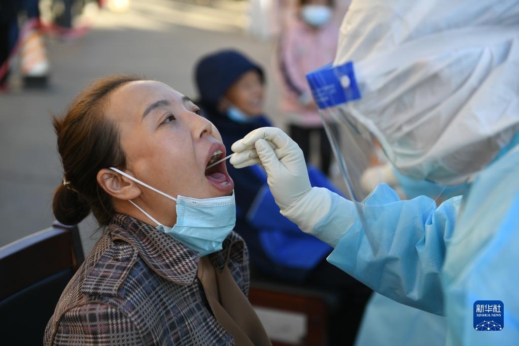 10月20日,在因疫情封控的阿拉善盟額濟納旗達來呼布鎮(zhèn)天賦佳苑小區(qū)內,醫(yī)務人員為居民進行核酸采樣。新華社記者 貝赫 攝