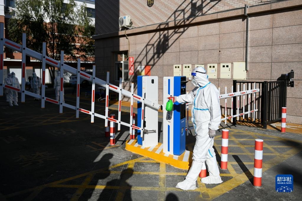 10月20日,在因疫情封控的阿拉善盟額濟納旗達來呼布鎮(zhèn)團結小區(qū)內,社區(qū)工作人員進行消殺工作。