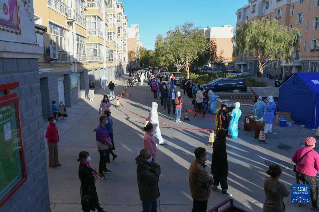 10月20日,在因疫情封控的阿拉善盟額濟納旗達來呼布鎮(zhèn)天賦佳苑小區(qū)內,核酸采樣工作有序開展。新華社記者 貝赫 攝