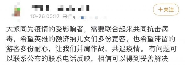 在社交媒體上,一名王姓女士通過短視頻呈現(xiàn)了一家人滯留額濟(jì)納的境況,在視頻中,她為同樣滯留在此的游客鼓勁:“如果你此時(shí)正在阿拉善,愿你如胡楊般堅(jiān)強(qiáng),積極應(yīng)對疫情?!边@條短視頻發(fā)出數(shù)小時(shí),就吸引了20余萬瀏覽量?! ?/p>