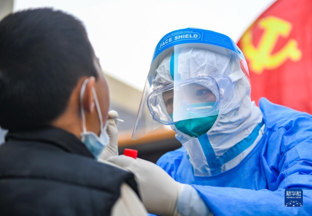 10月25日,在呼和浩特市賽罕區(qū)昭烏達(dá)南路街道惠民社區(qū)核酸檢測(cè)點(diǎn),醫(yī)護(hù)人員為居民進(jìn)行核酸檢測(cè)。