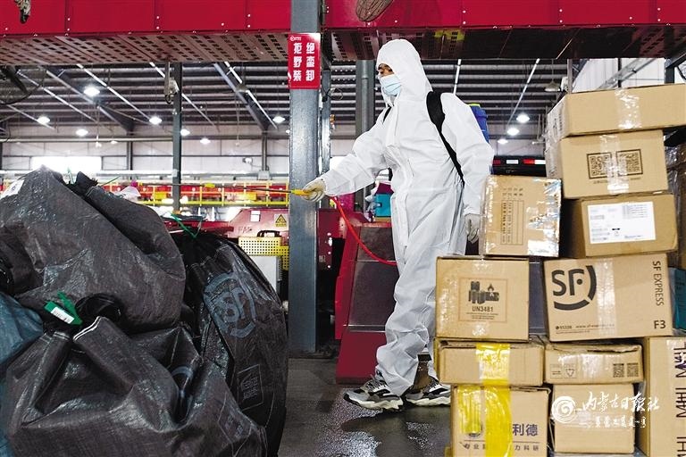 11月18日,內(nèi)蒙古順豐速運有限公司呼和浩特市金山分揀中心的工作人員正在對快遞包裹進行消毒。連日來,我區(qū)各快遞企業(yè)加強投遞、攬收等一線從業(yè)人員個人防護,對到場地的快遞包裹執(zhí)行每天定時消殺工作,全力保障每一單快遞的安全。(內(nèi)蒙古日報記者 懷特烏勒斯攝)