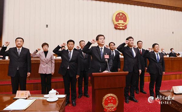12月14日上午,自治區(qū)十三屆人大常委會(huì)第三十二次會(huì)議舉行了憲法宣誓儀式。自治區(qū)黨委書(shū)記、人大常委會(huì)主任石泰峰主持并監(jiān)誓。圖為新任職人員在依法進(jìn)行憲法宣誓。 內(nèi)蒙古日?qǐng)?bào)社融媒體記者 袁永紅 攝