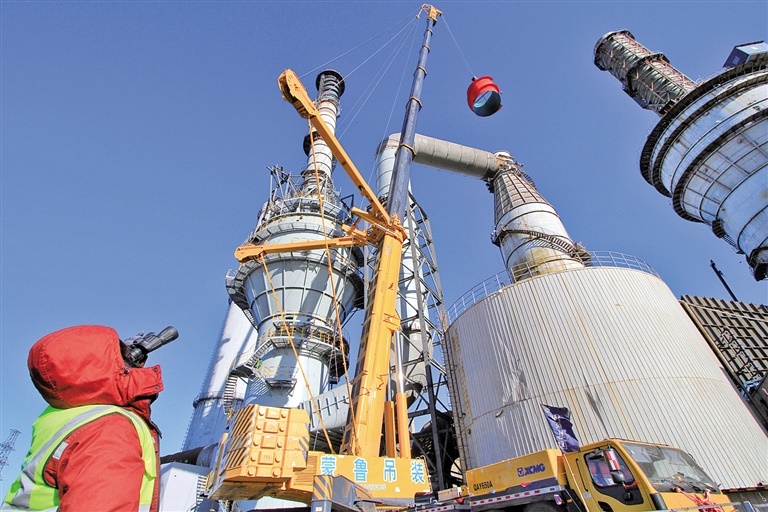 包鋼節(jié)能環(huán)保改造項(xiàng)目——脫硫塔筒吊裝現(xiàn)場(chǎng)。