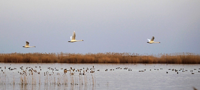 蘆葦蕩漾,鴻雁飛翔。此刻,鳥(niǎo)類攝影愛(ài)好者馬海明扛起他的相機(jī),駕著破冰艇駛向?yàn)趿核睾5纳钐?。他平靜地說(shuō):“再過(guò)些日子,這里的鳥(niǎo)更多、魚(yú)更歡,拍出來(lái)的照片會(huì)更美更精彩?!?/p>