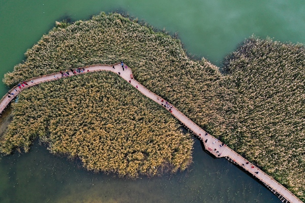 2021年10月17日,游客在居延海景區(qū)游玩(無人機(jī)照片)。新華社記者 劉磊 攝