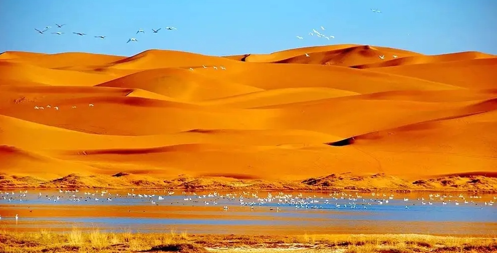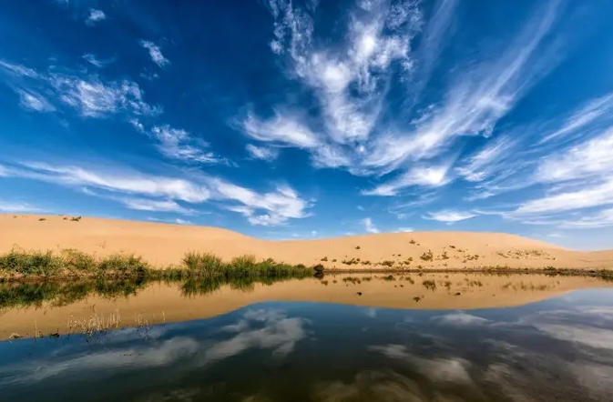 巴丹吉林沙漠年降水量不足40毫米,但是沙漠中的湖泊竟然多達100多個。高聳入云的沙山,神秘莫測的鳴沙,靜謐的湖泊、濕地,構(gòu)成了巴丹吉林沙漠獨特的迷人景觀,于2005年被《中國國家地理》雜志評為中國最美麗的沙漠,每年吸引了上萬名國內(nèi)外游客前來觀光。