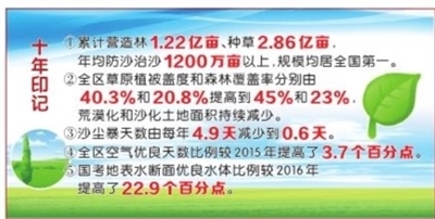累計(jì)營造林1.22億畝、種草2.86億畝,年均防沙治沙1200萬畝以上,規(guī)模均居全國第一;全區(qū)草原植被蓋度和森林覆蓋率分別由40.3%和20.8%提高到45%和23%,荒漠化和沙化土地面積持續(xù)減少;全區(qū)空氣優(yōu)良天數(shù)比例較2015年提高3.7個(gè)百分點(diǎn),國考地表水?dāng)嗝鎯?yōu)良水體比例較2016年提高22.9個(gè)百分點(diǎn)……