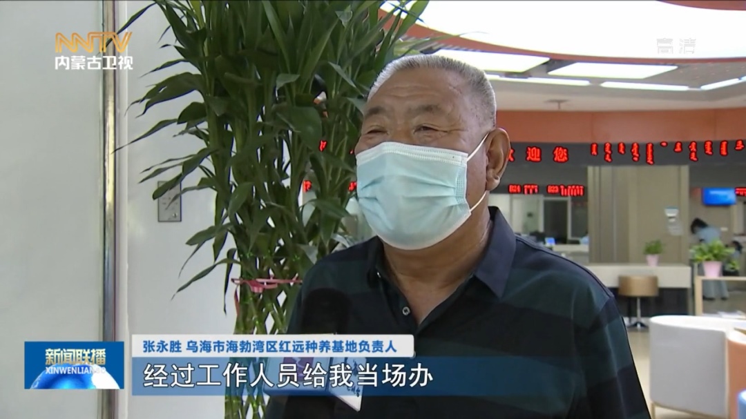 張永勝 烏海市海勃灣區(qū)紅遠種養(yǎng)基地負責(zé)人 我原來想的辦這個東西挺費勁,經(jīng)過工作人員給我當(dāng)場辦,比我想象的還要快,我非常高興。